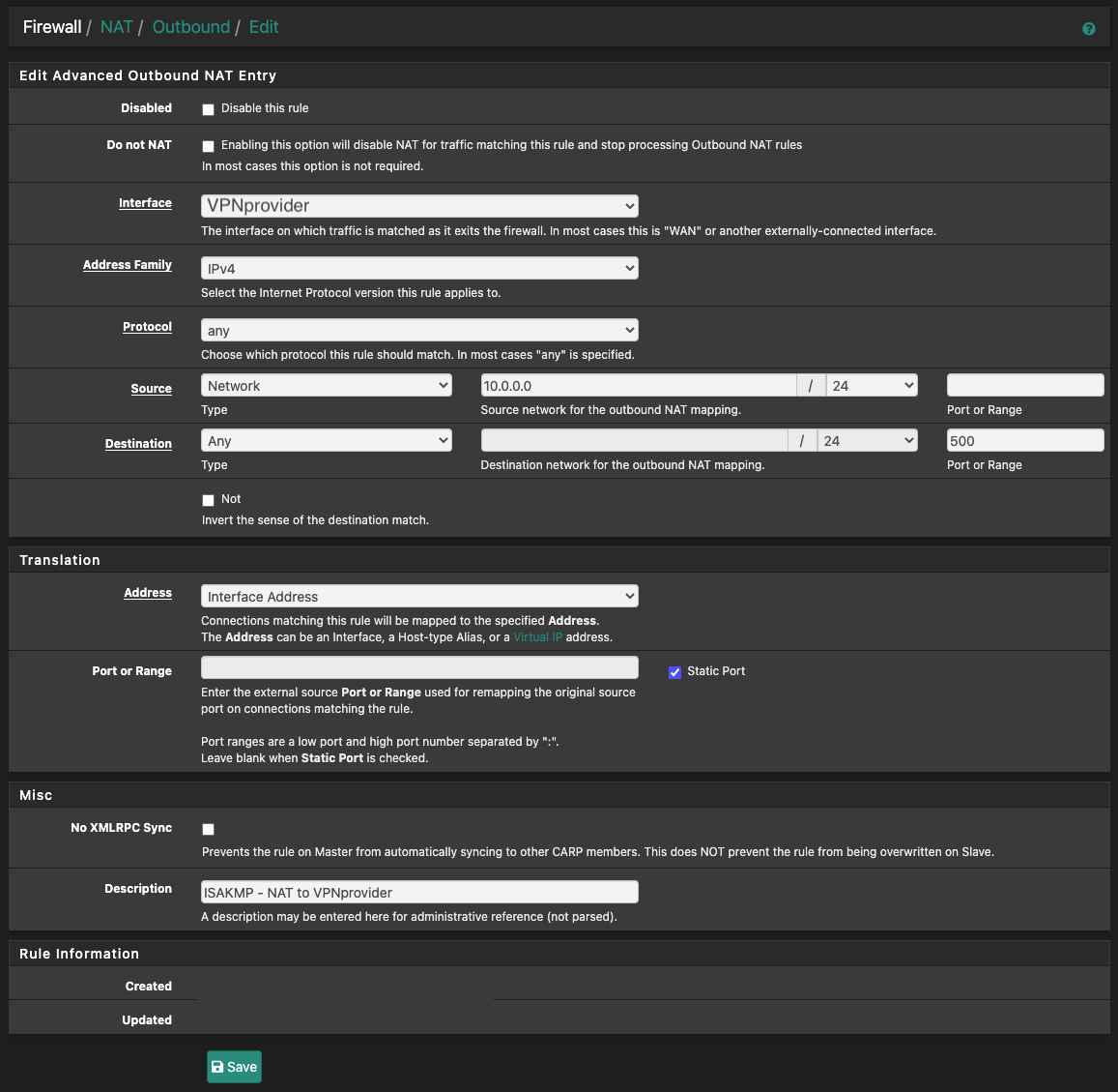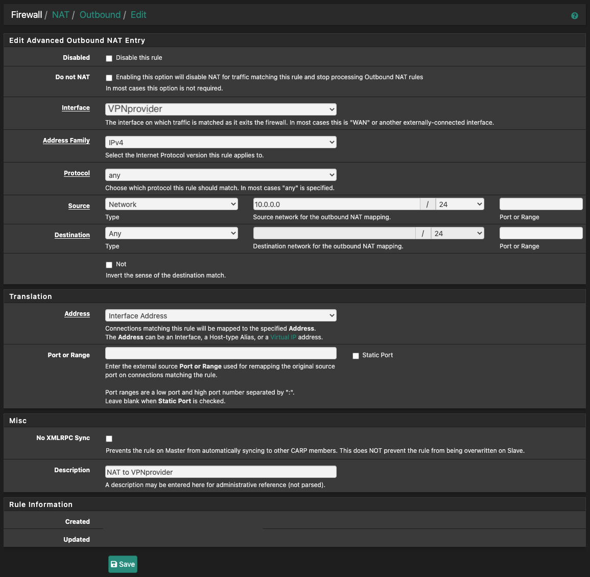 In this example, 10.0.0.0/24 will be NATed via pfSense's VPN tunnel IP address.
